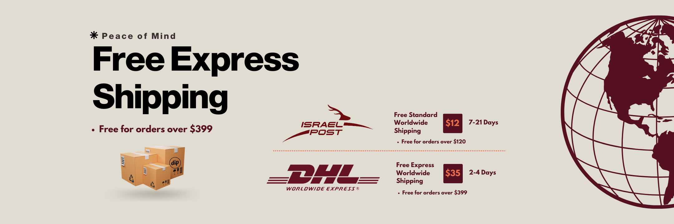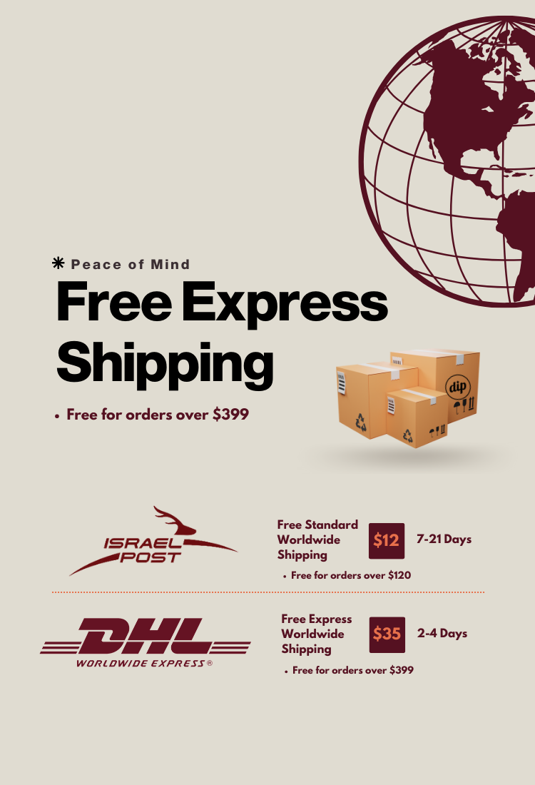 We proudly offer delivery to over 100 countries worldwide! We use DHL Express service or Israel Post. Enjoy the convenience of one business day dispatch, where your order will be promptly processed and prepared for shipment immediately upon payment receipt.